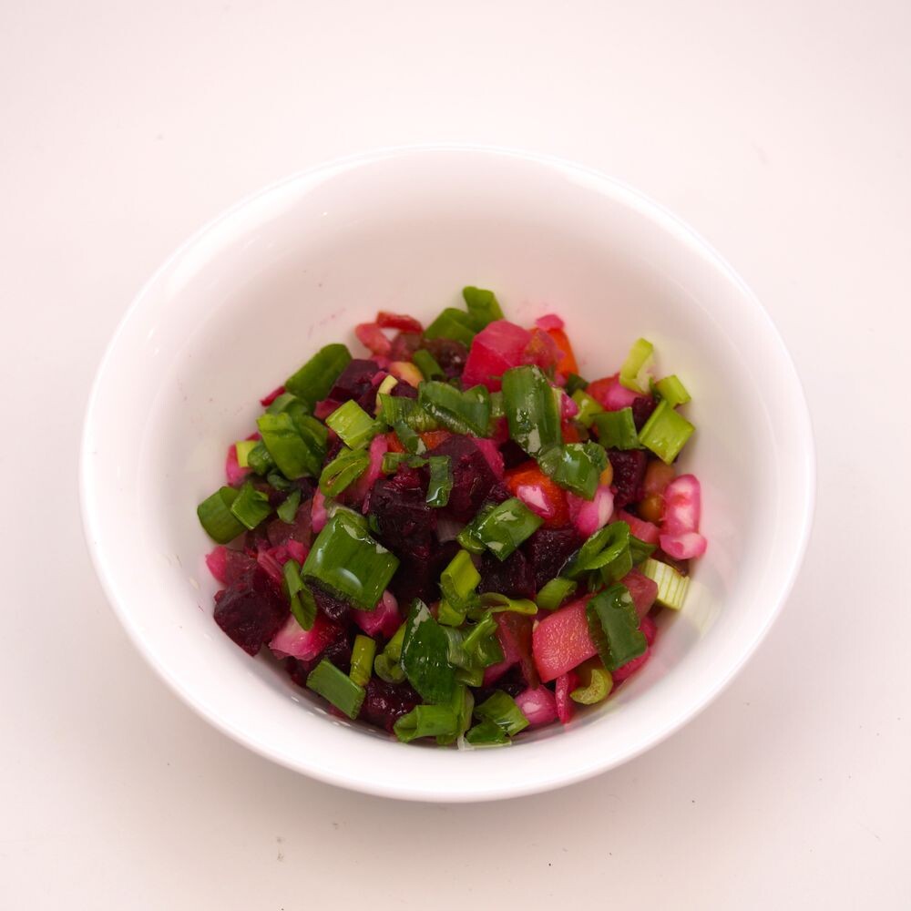 свекла, картофель, морковь, горошек зеленый, огурцы соленые, капуста квашеная, лук зеленый, масло подсолнечное первого холодного отжима.