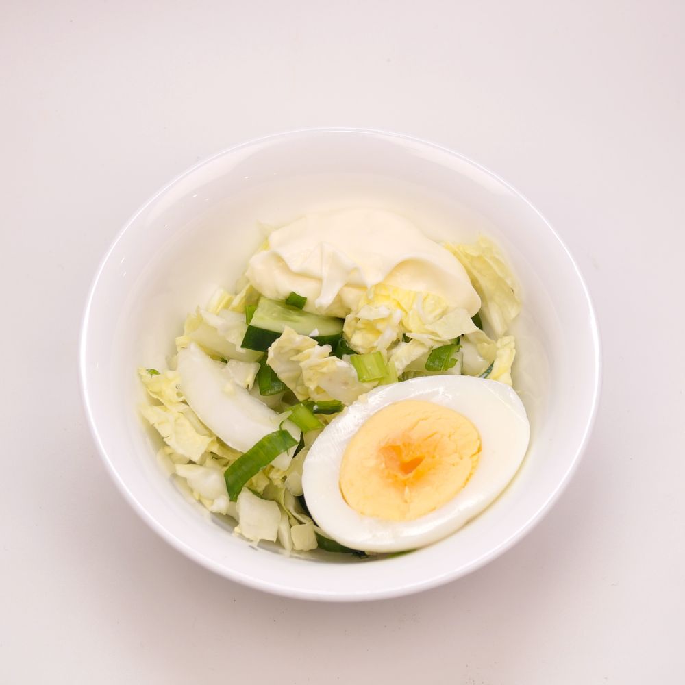 капуста пекинская, огурцы, яйцо куриное, йогурт греческий, лук зеленый. Аллергены: яйца, молоко.