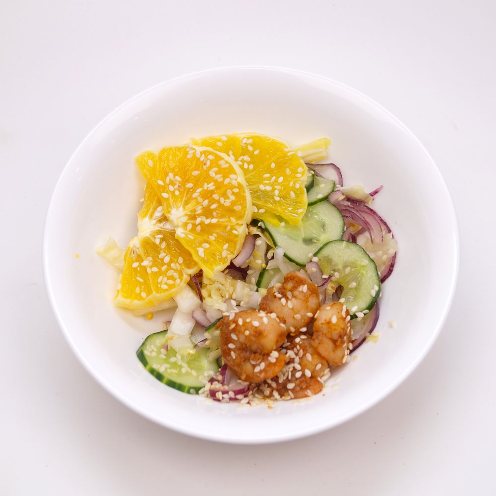 "капуста пекинская, креветки, апельсины, огурцы, лук красный, масло подсолнечное первого холодного отжима, сахар, соль, лимонный сок, чеснок, горчица зернистая, кунжут. Аллергены: молюски, горчица, кунжут. "