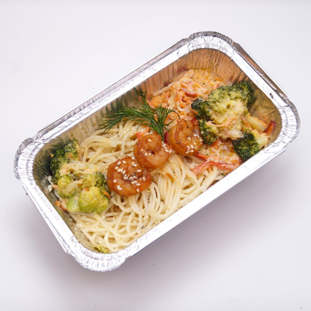 макаронные изделия спагетти, креветки, морковь, лук репчатый, перец болгарский, капуста брокколи, кокосовое молоко, паста том ям, чеснок, соус соевый, масло подсолнечное рафинированное, соль, кунжут, паприка, кориандр, укроп, кумин. Аллергены: глютен, молюски, соя.