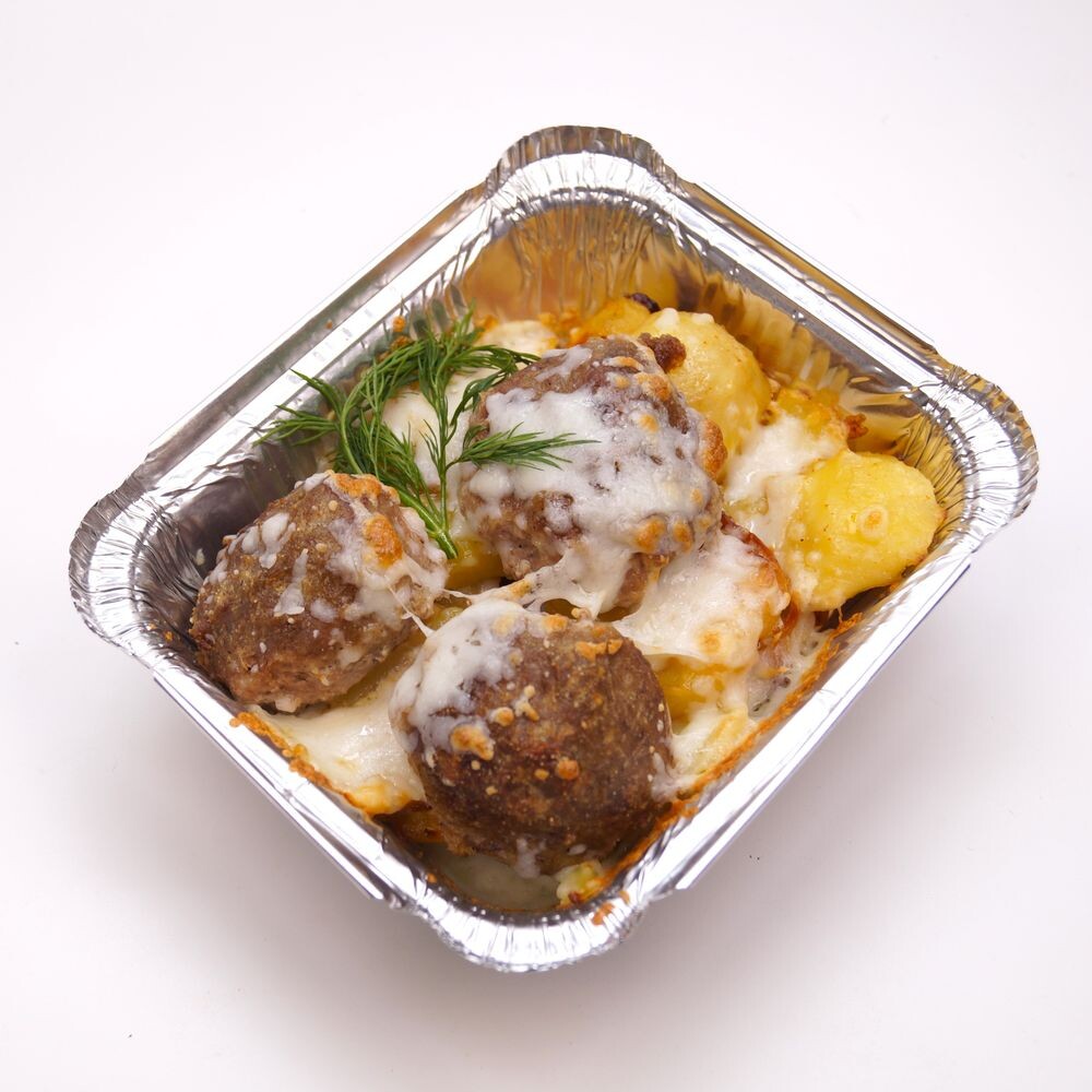 картофель, фарш филейный, лук репчатый, яйцо куриное, масло подсолнечное рафинированное, сыр плавленый сливочный, сырный продукт, чеснок, соль, перец черный молотый, горчица, паприка, перец красный, петрушка, кориандр. Аллергены: яйца, горчица, молоко.