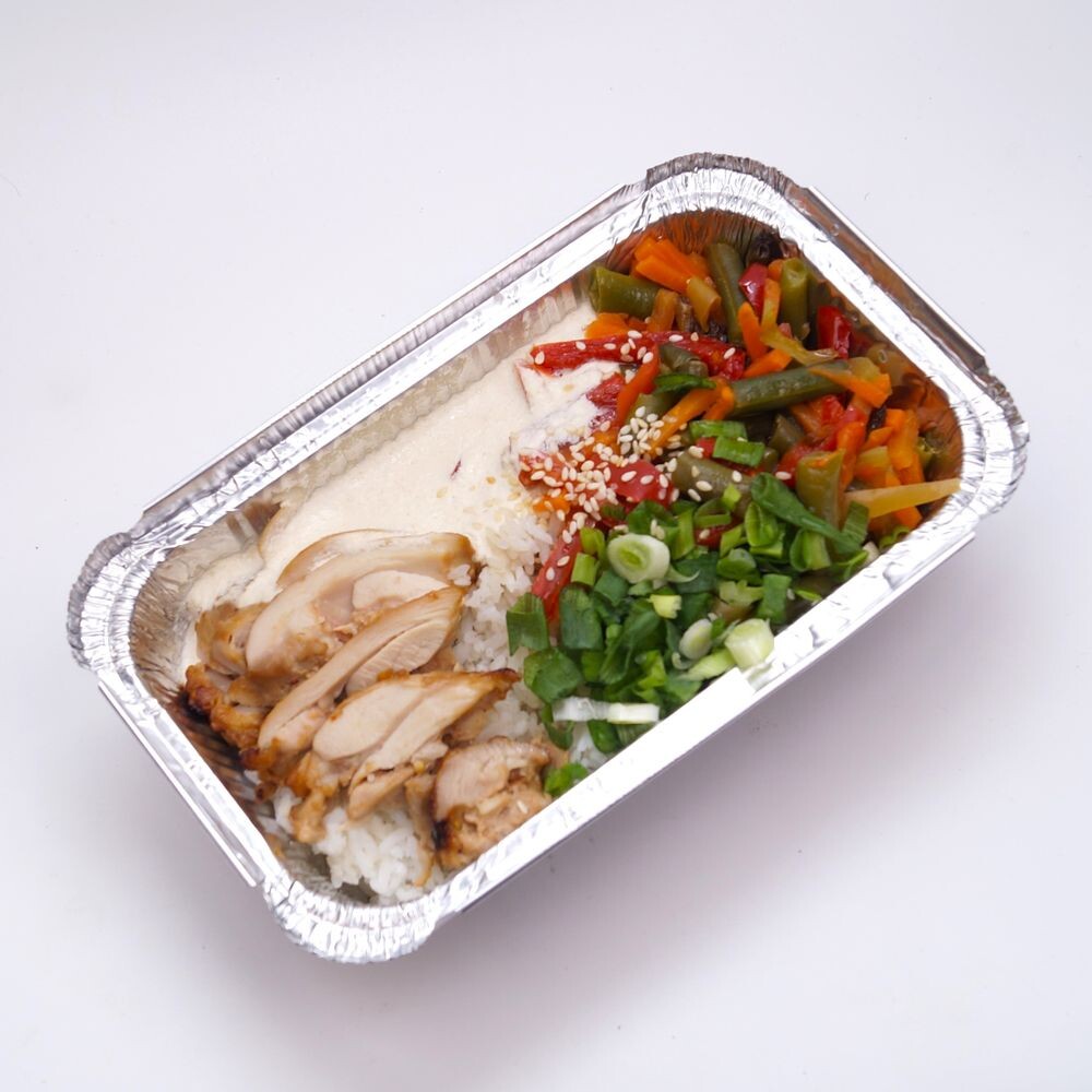 рис басмати, куриное филе бедра, горошек зеленый, фасоль стручковая, кукуруза зерно, морковь, лук репчатый, перец болгарский, майонез, сыр плавленный сливочный, соус соевый, соус устричный, аджика, паста том ям, паприка копченая, соль, сахар, крахмал, кунжут, лук зеленый. Аллергены: горчица, молоко, соя, яйцо.