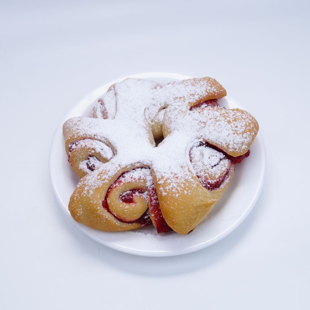 тесто дрожжевое: вода, масло подсолнечное нераф холод отжима, мука пшеничная, дрожжи, соль, сахар; повидло яблоко-вишня, масло подсолнечное рафинированное, сахарная пудра. Аллергены: глютен.